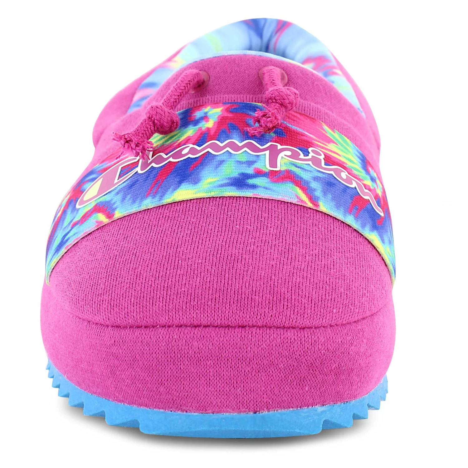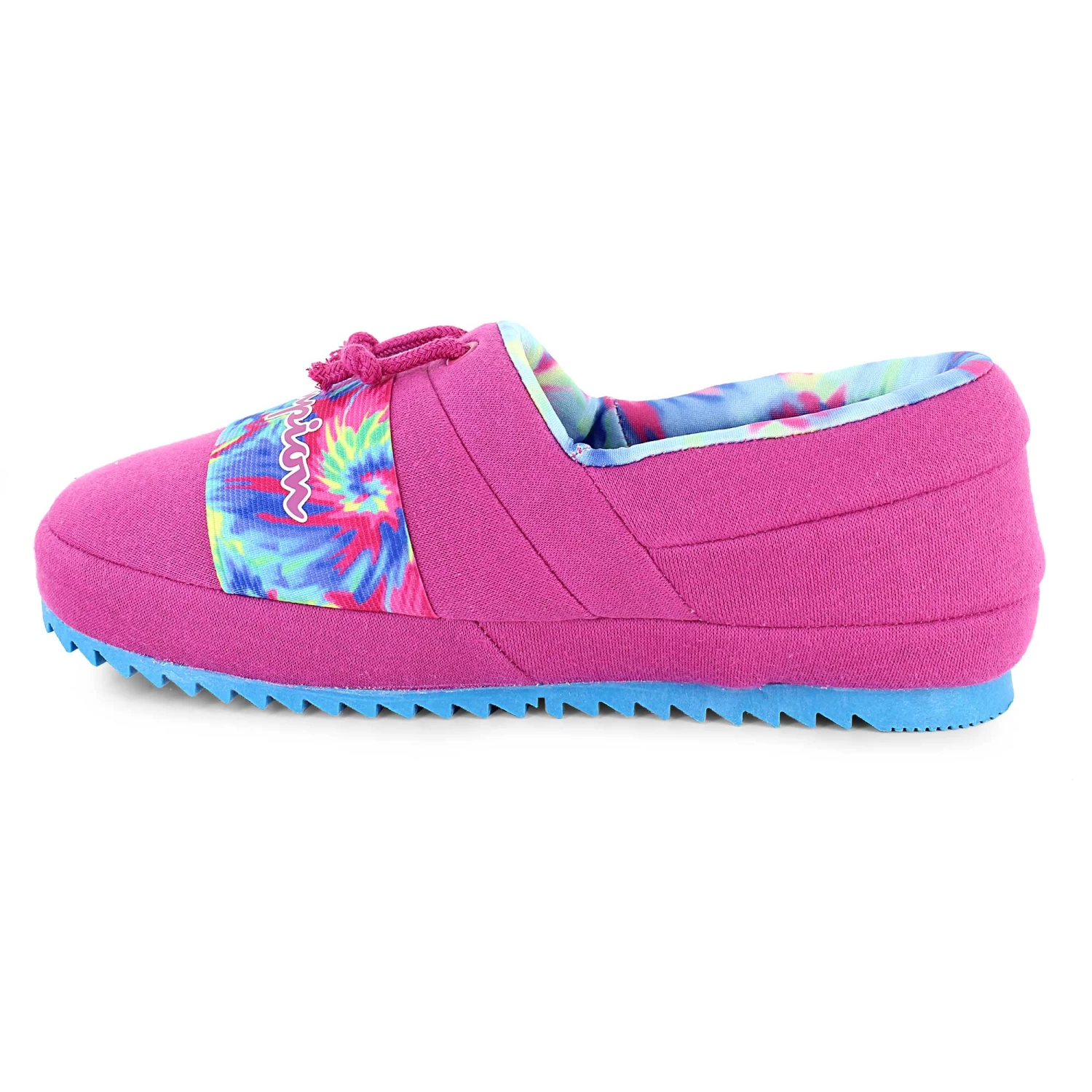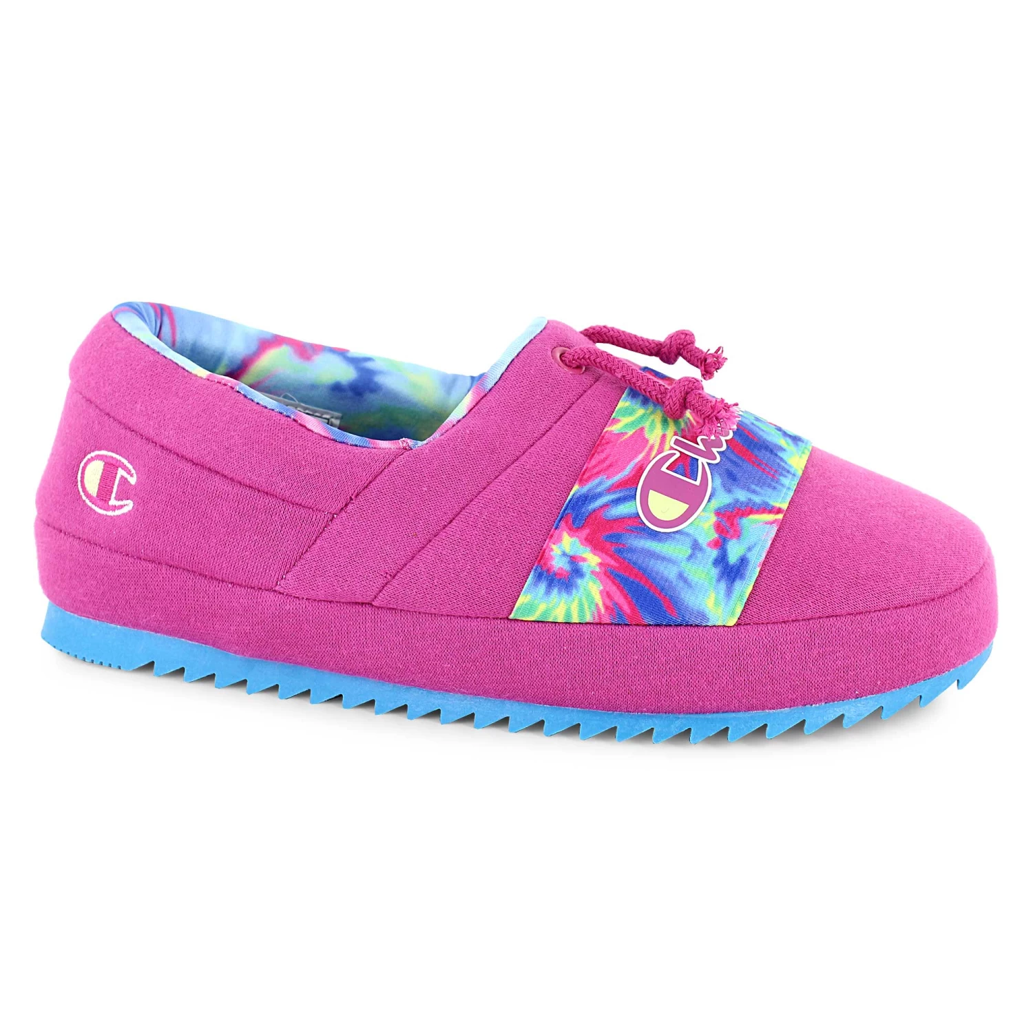 Sit back and relax in these cushy Champion slippers. The slip-on design features an elastic band on top so you can be sure these slippers stay on securely. The no-slip grip outsole makes them practical as well as comfortable. Available now at SHOE SHOW MEGA.