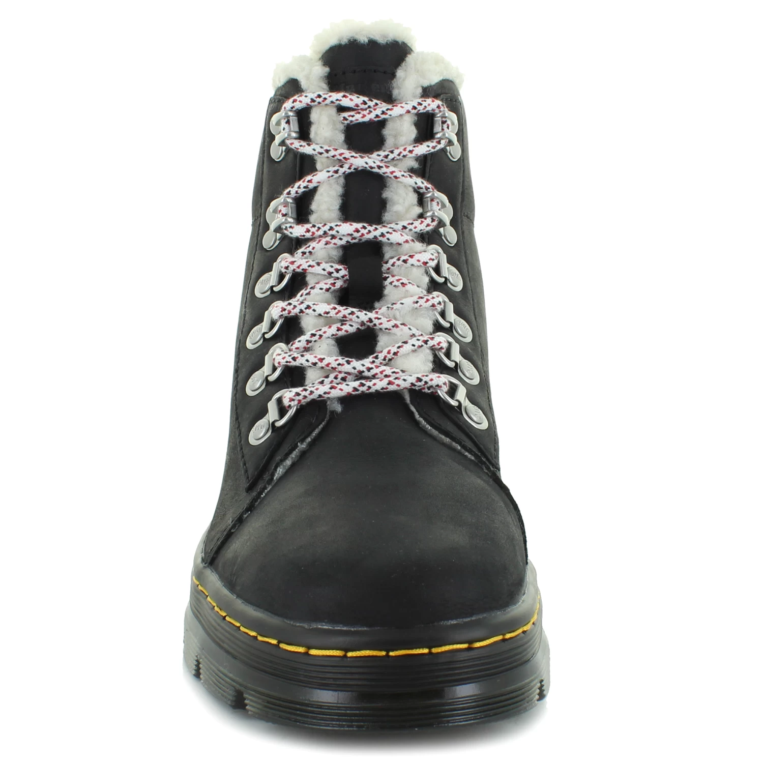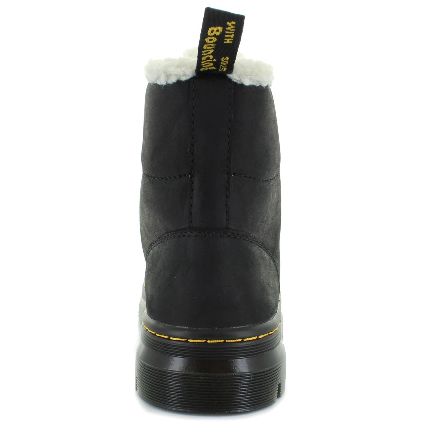 Classic rugged leather boots by Dr. Martens. This style features a lace-up front with stitching details. The faux-fur lining will keep your feet warm and comfy.
