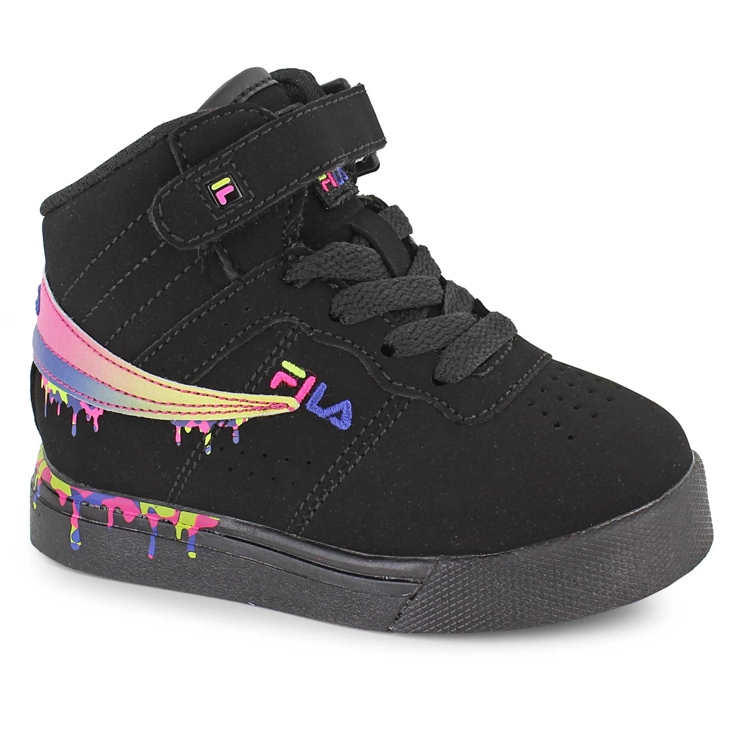 Watch them go all out in these bold and colorful Fila Vulc court sneakers. They can wear them as they build up their skill as well as while playing outside with friends and family. A bold paint drip effects on the midsole, padded footbed, and secure fit means these shoes stand and deliver.