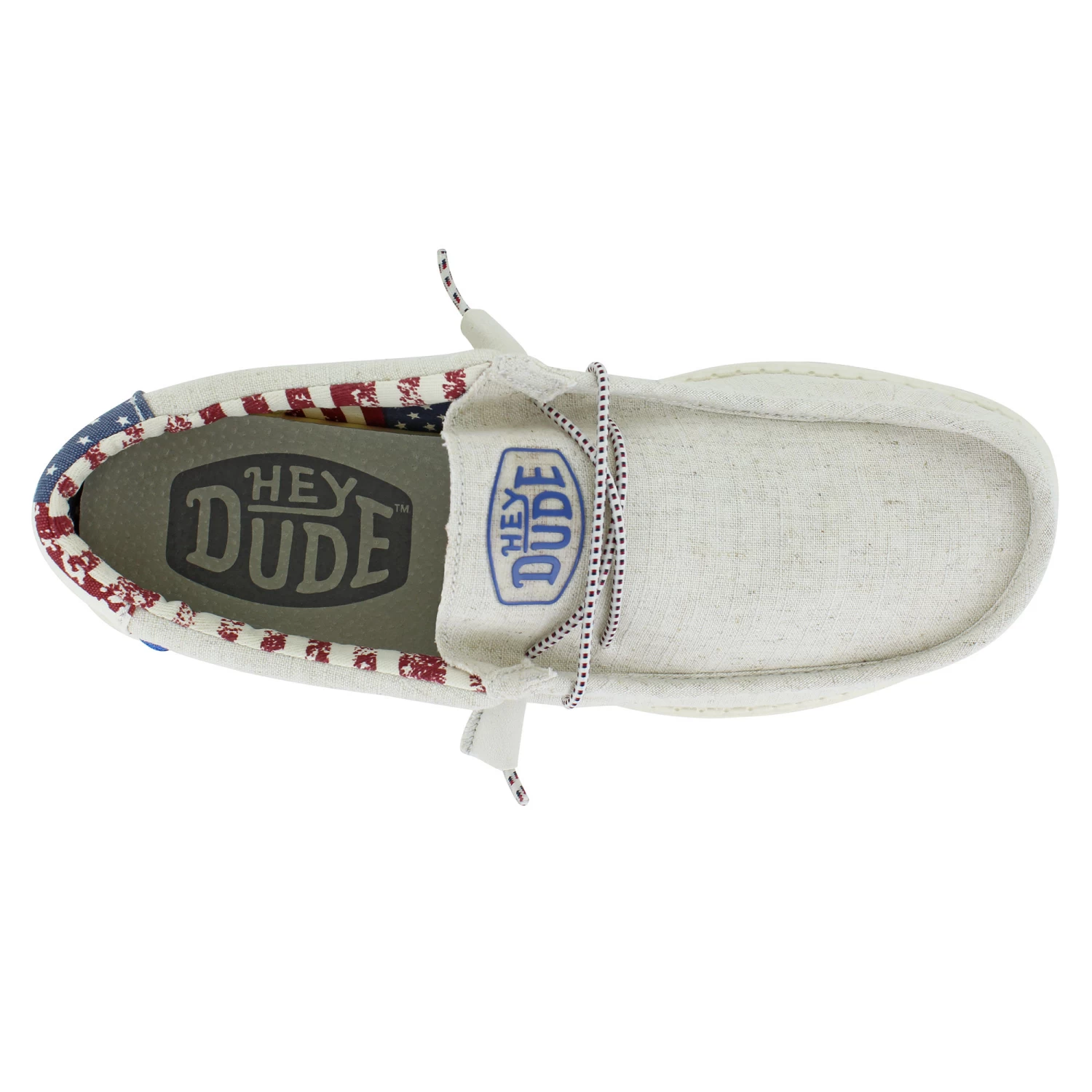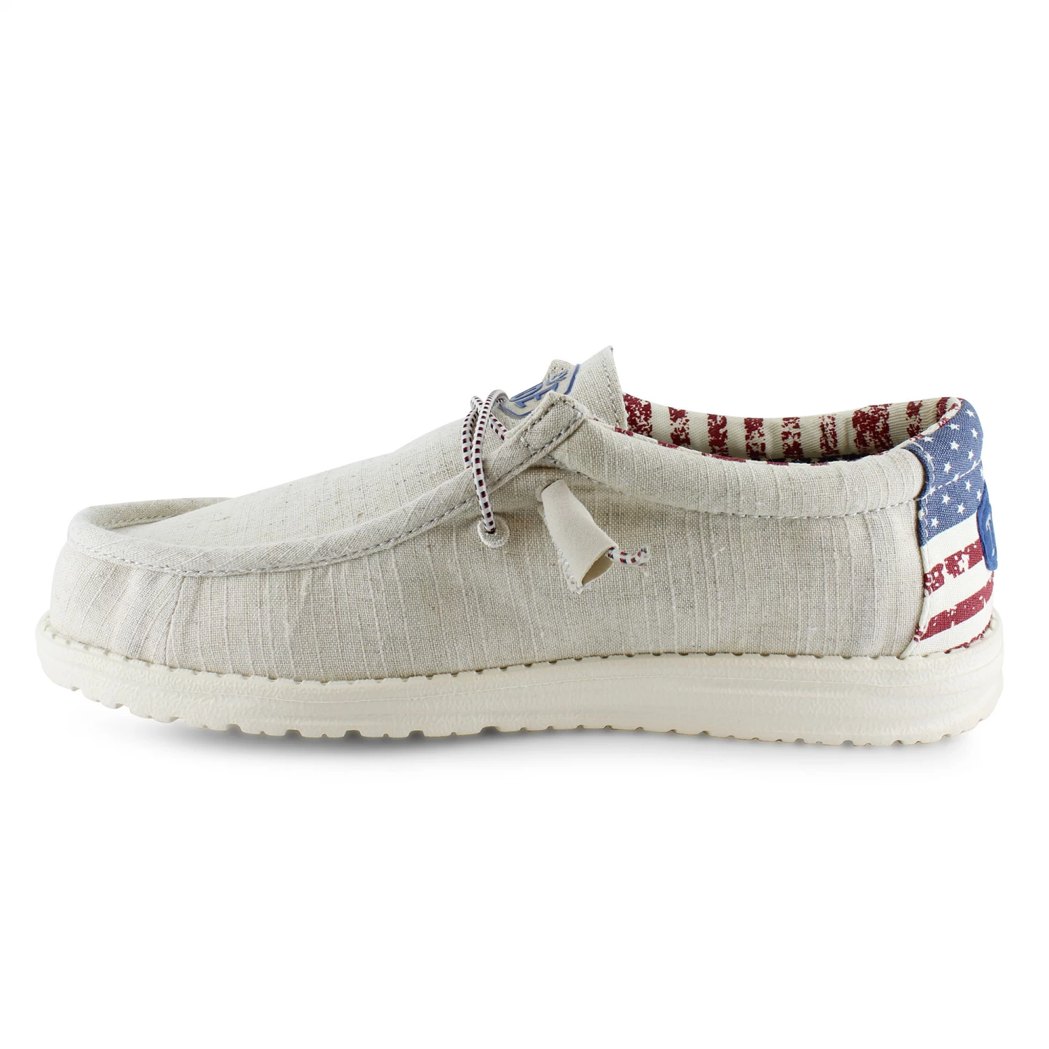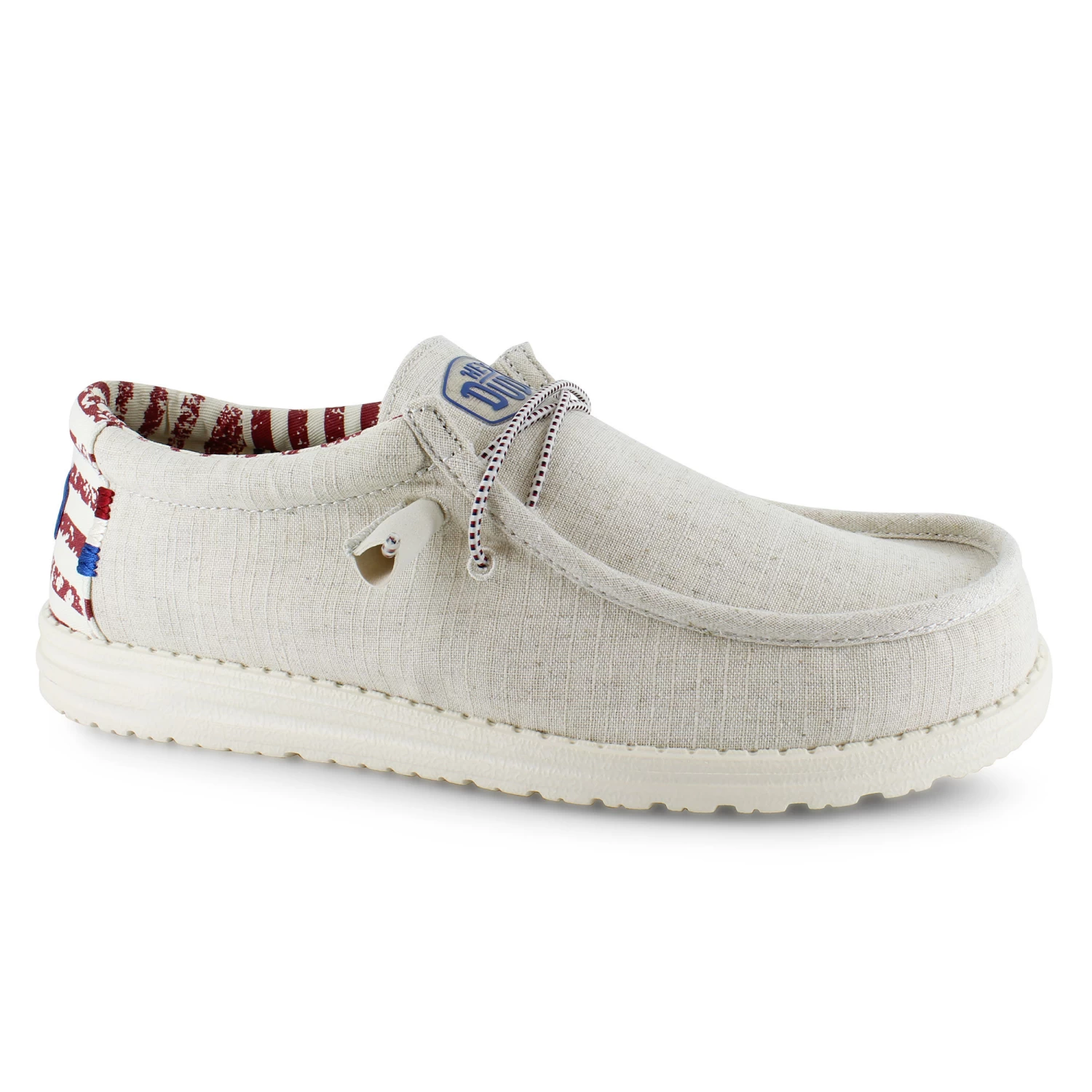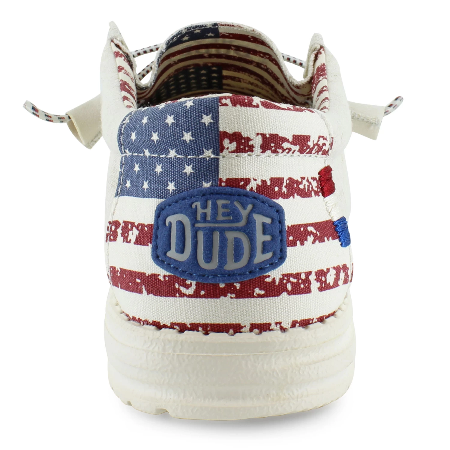 The Hey Dude Wally Patriotic is lightweight and crafted for year-round wear. Built for long-lasting comfort and style, this moc-toe slip-on is crafted with a breathable knitted cotton fabric upper that conforms to the shape of your foot for a snug fit. Featuring a contrasting heel counter with an American flag design and elastic bungee laces that allow for an easier on and off making this shoe the perfect on-the-go casual shoe. With a padded collar and a soft patterned cloth lining for added style as well as a memory foam insole for extra support, the Wally caters to any and all lifestyles and occasions with cool casual comfort.