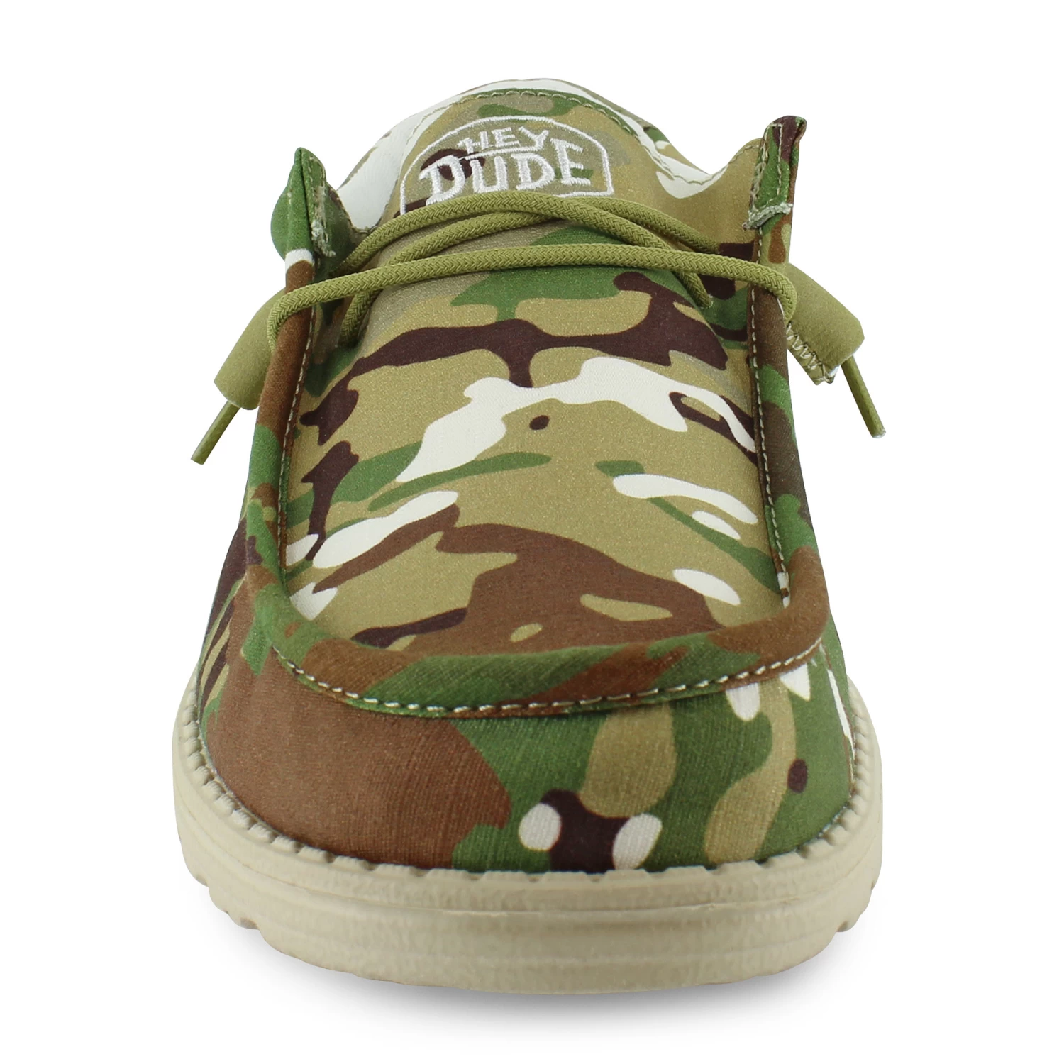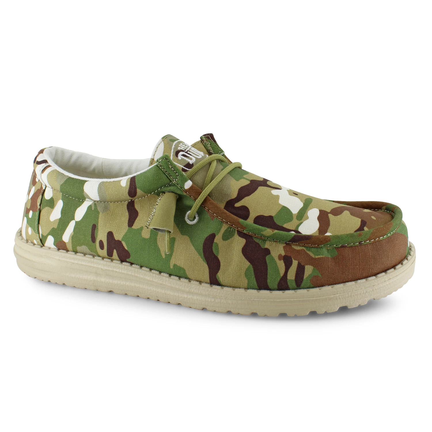 The Hey Dude Wally Ripstop is lightweight and crafted for year-round wear. Built for versatile comfort and style, this moc-toe slip-on is crafted with a durable canvas upper with a handsome camouflage pattern. Featuring elastic bungee laces that allow for an easier on and off, making this shoe the perfect on-the-go casual shoe. With a padded collar and a soft fabric lining as well as a memory foam insole for extra support, the Wally caters to any and all lifestyles and occasions with cool casual comfort.