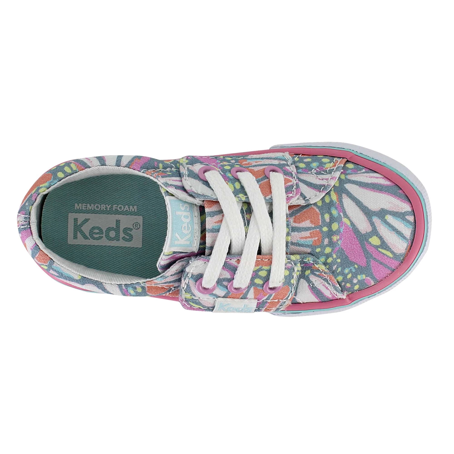Bring comfortable classic style to their day with these playful Keds shoes. Colorful graphics pair well with summer dresses or casual jeans. A large strap closure with faux laces combines old-school style with modern convenience.