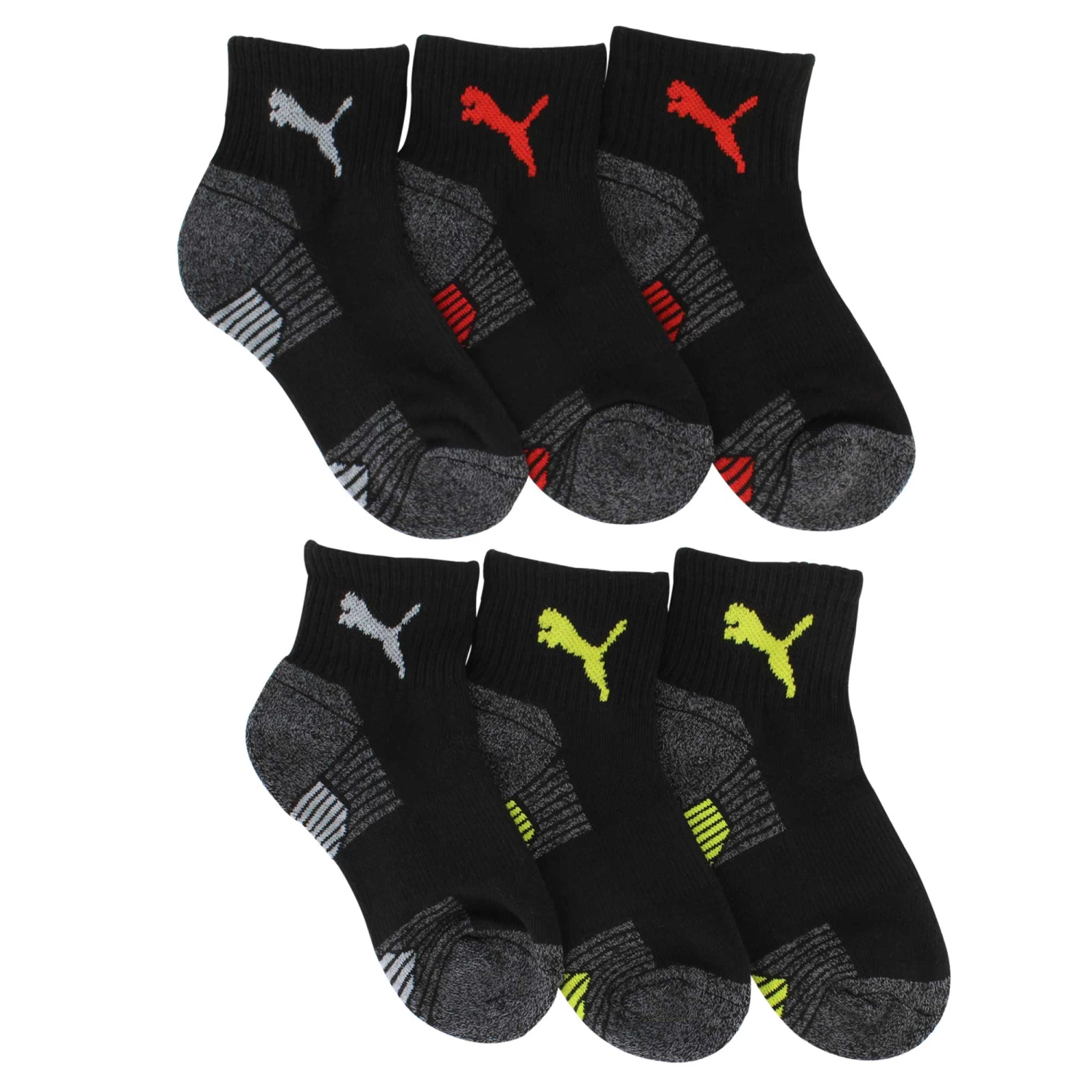 Stock up with this multipack of PUMA quarter crew socks. They are the perfect choice for your young one’s casual day or athletic play. These socks offer a cushioned sole, moisture control and arch support to keep them comfortable.