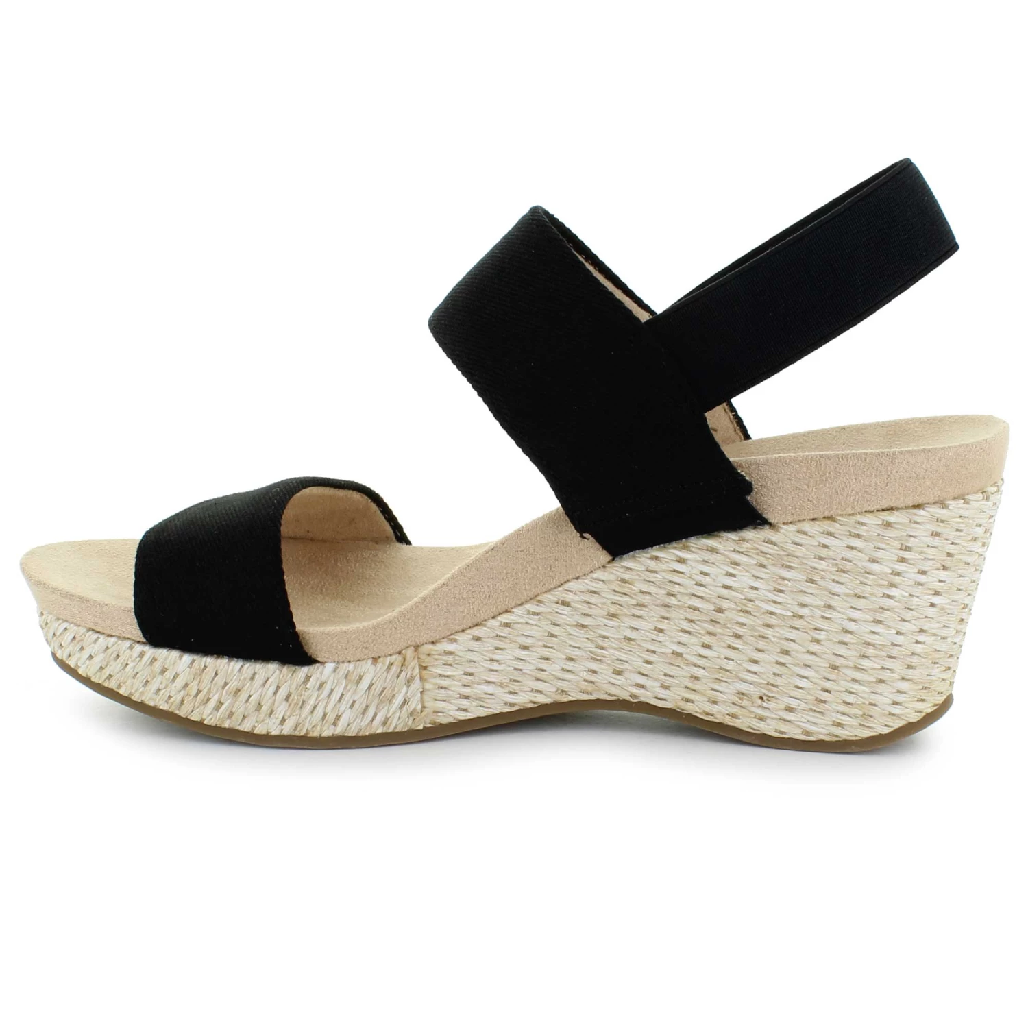 Keep your style options open in this comfy wedge. Fabric upper with an open-toe, slip-on fit, woven heel, and elastic goring slingback strap for extra flexibility.