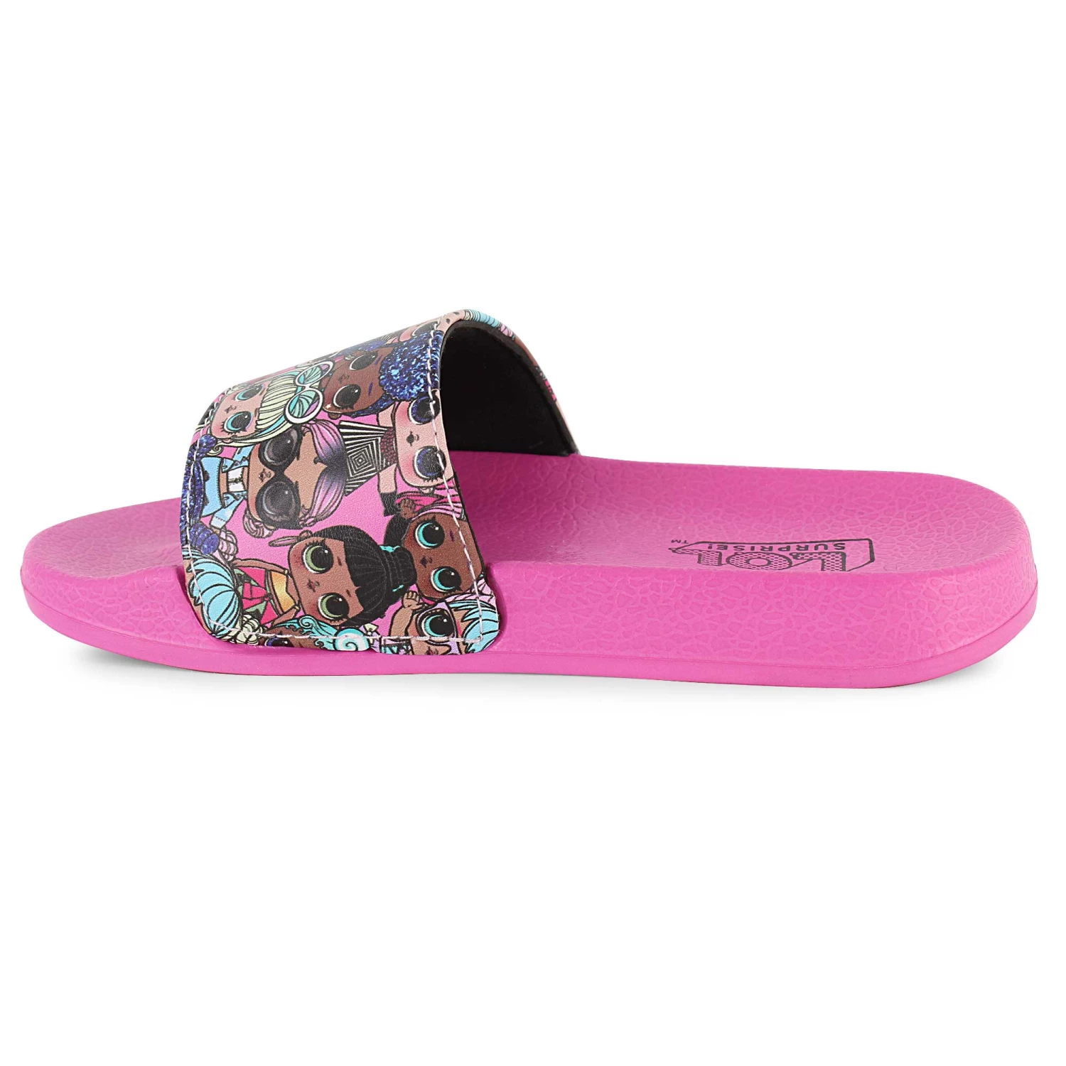 Celebrate summer fun with these cute L.O.L. Surprise! slide sandals. The strap features favorite characters in a playful collage of color that will pair well with shorts, jeans, leggings and more. Slip them on for a casual trip out with family or friends in style.