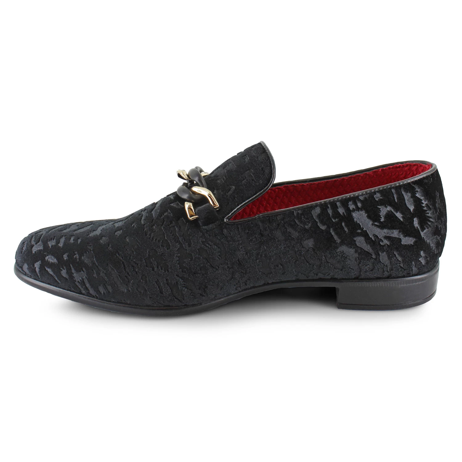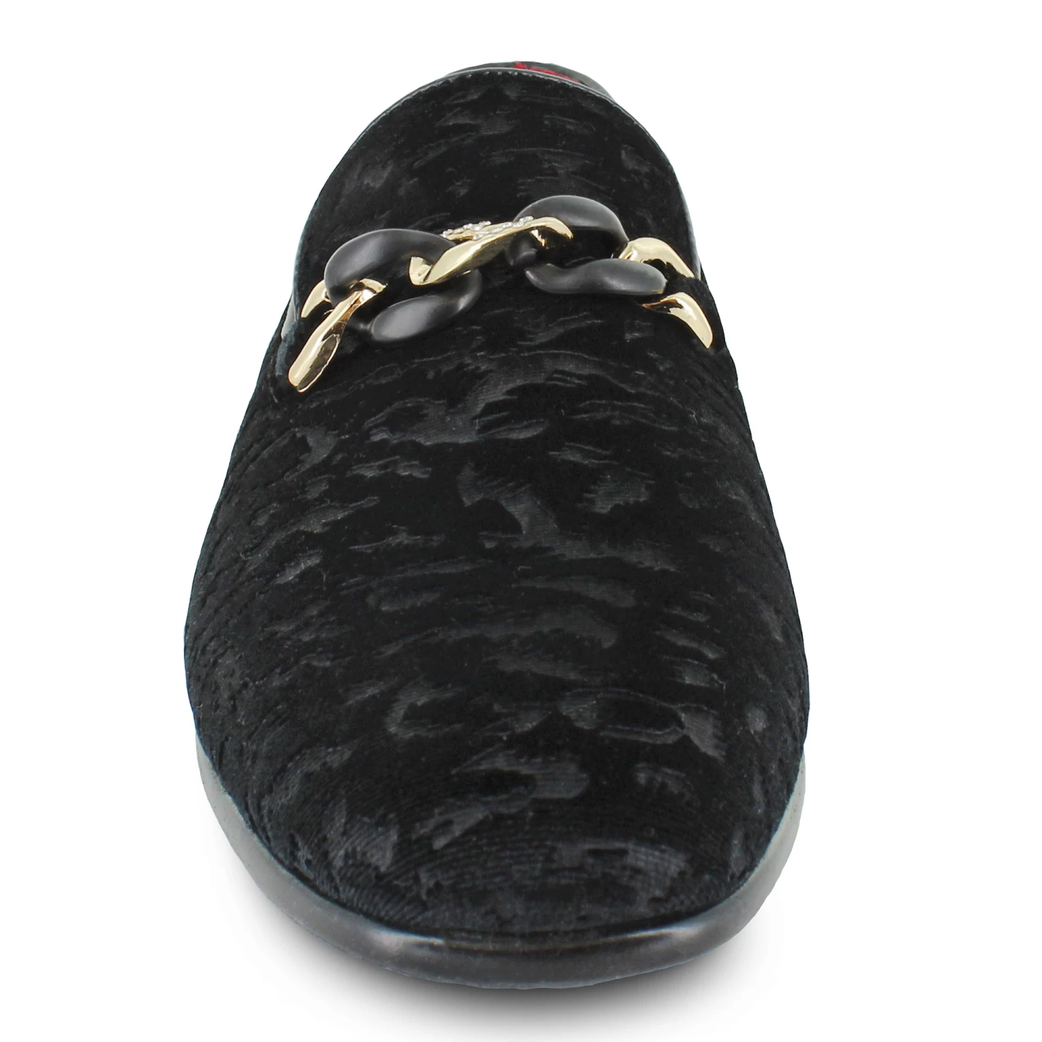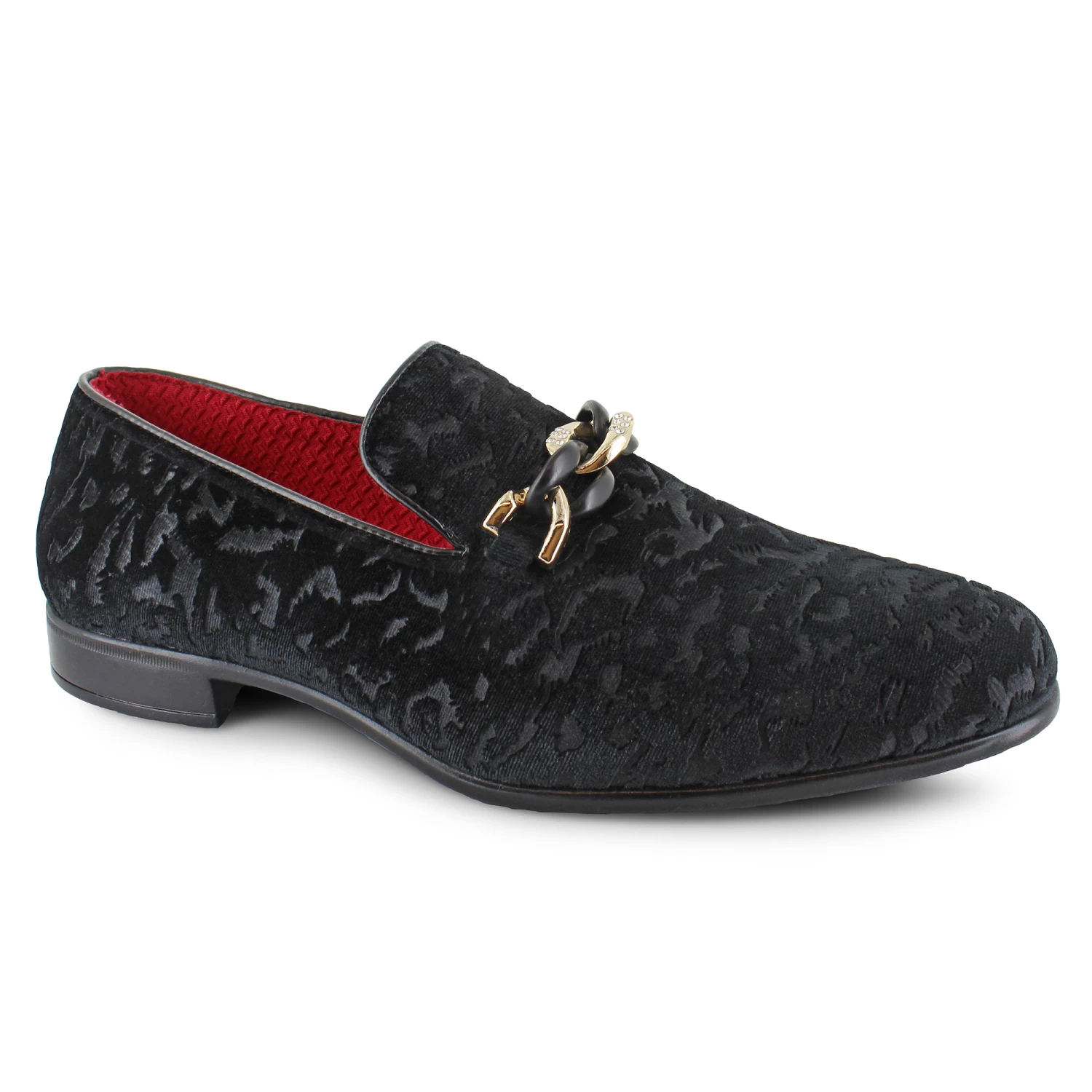 Dive into your next handsome look with the Oliver Mason Theo providing bold style to dress up any outfit. This classy smoking slipper is sure to turn heads with an embossed velvet upper that features a gold and black chain bit with subtle jewels for added flair. A cushioned insole ensures all-day comfort while a durable rubber outsole keeps a bounce to your step.