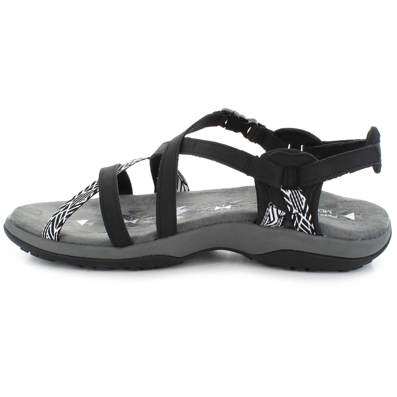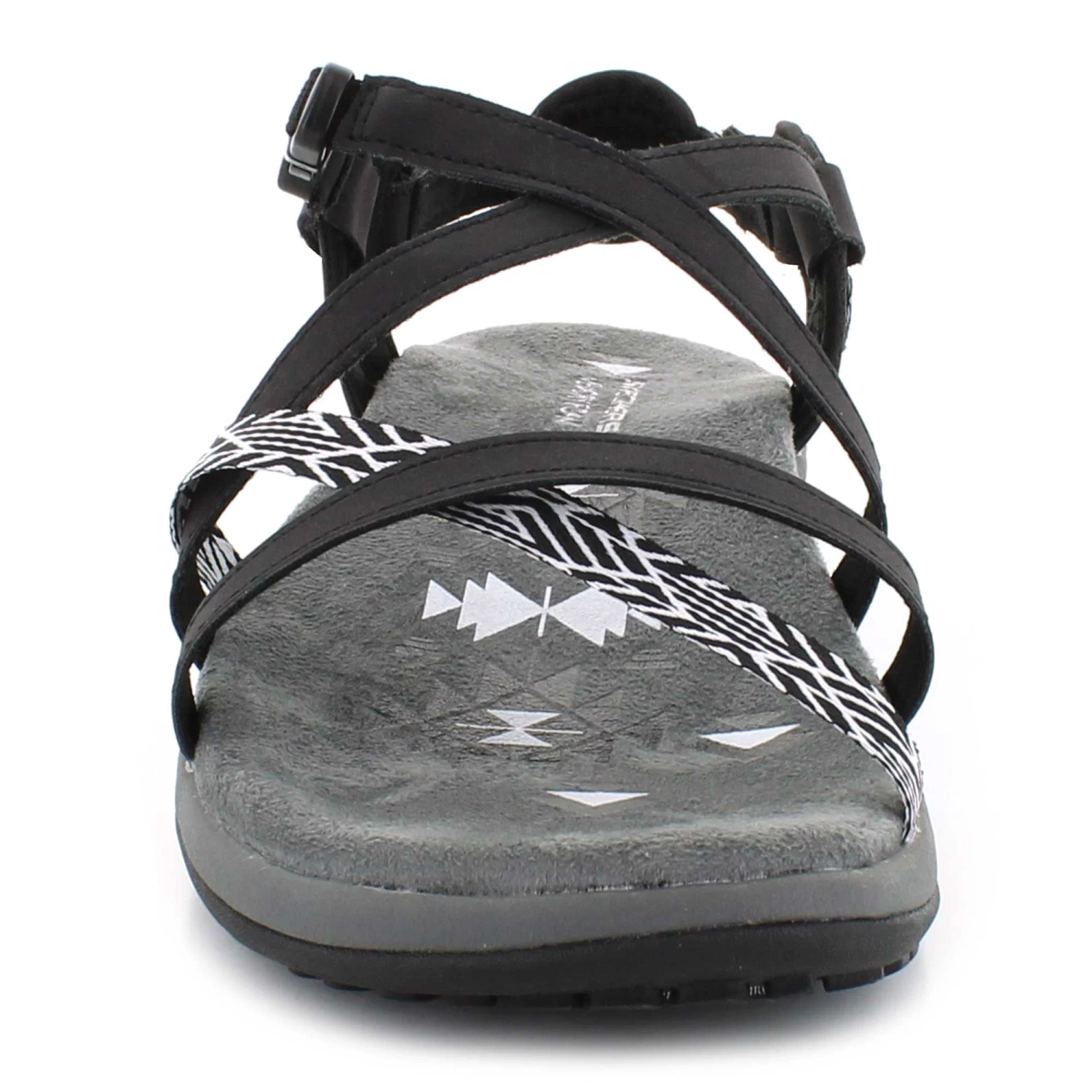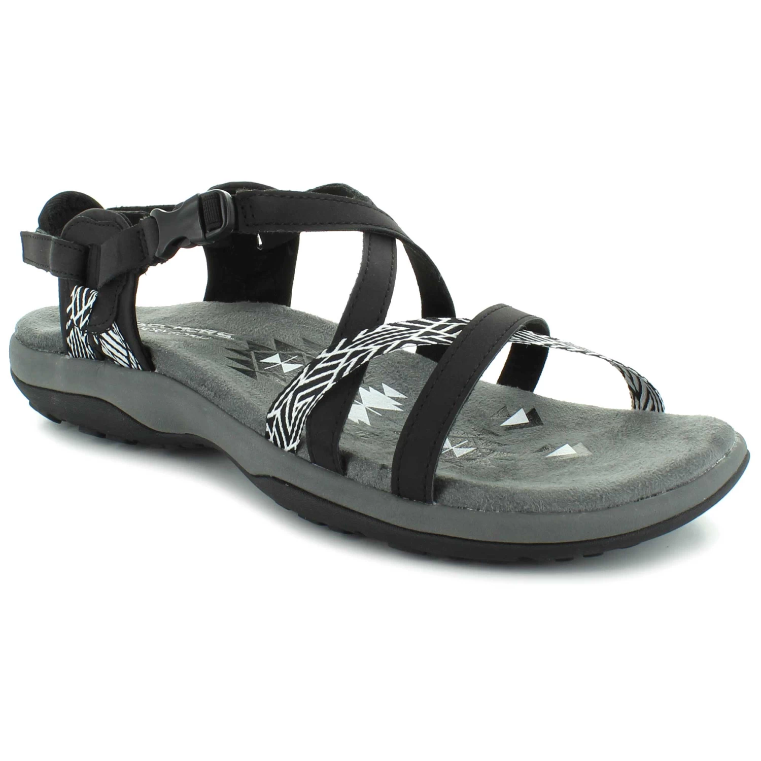 The Skechers Reggae Slim – Staycation sandal will be your perfect go-to staple this season. This sporty strappy sandal features a faux leather and fabric upper with geo print accent and cushioned Memory Foam comfort footbed.