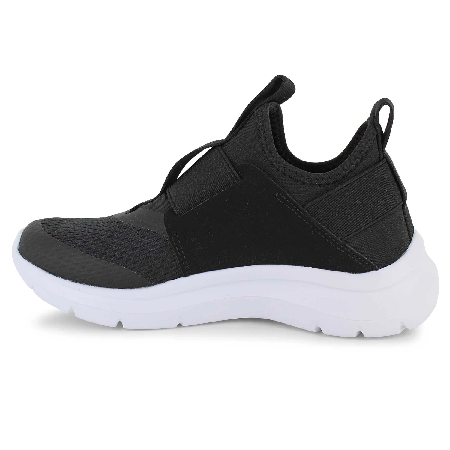 - slip-on shoe with elastic top strap and heel brace for a secure fit