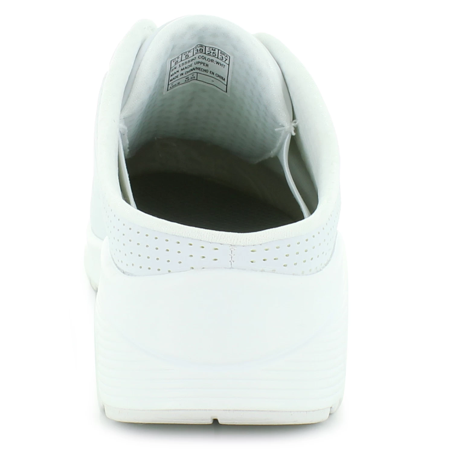 Slip on a fresh kick of stylish comfort wearing Skechers Street Uno – Open Air. This fashion sneaker mule features a synthetic durabuck and mesh upper with stretch laces, Skechers Air-Cooled Memory Foam insole, and a platform wedge with visible Skech-Air air-cushioned midsole.