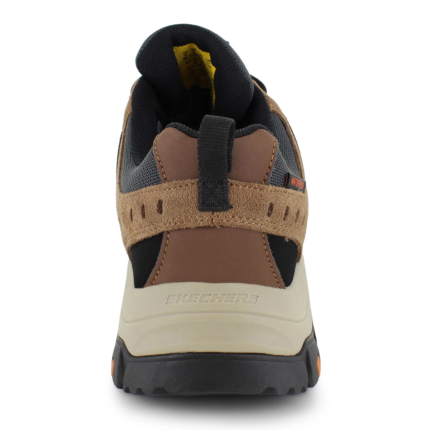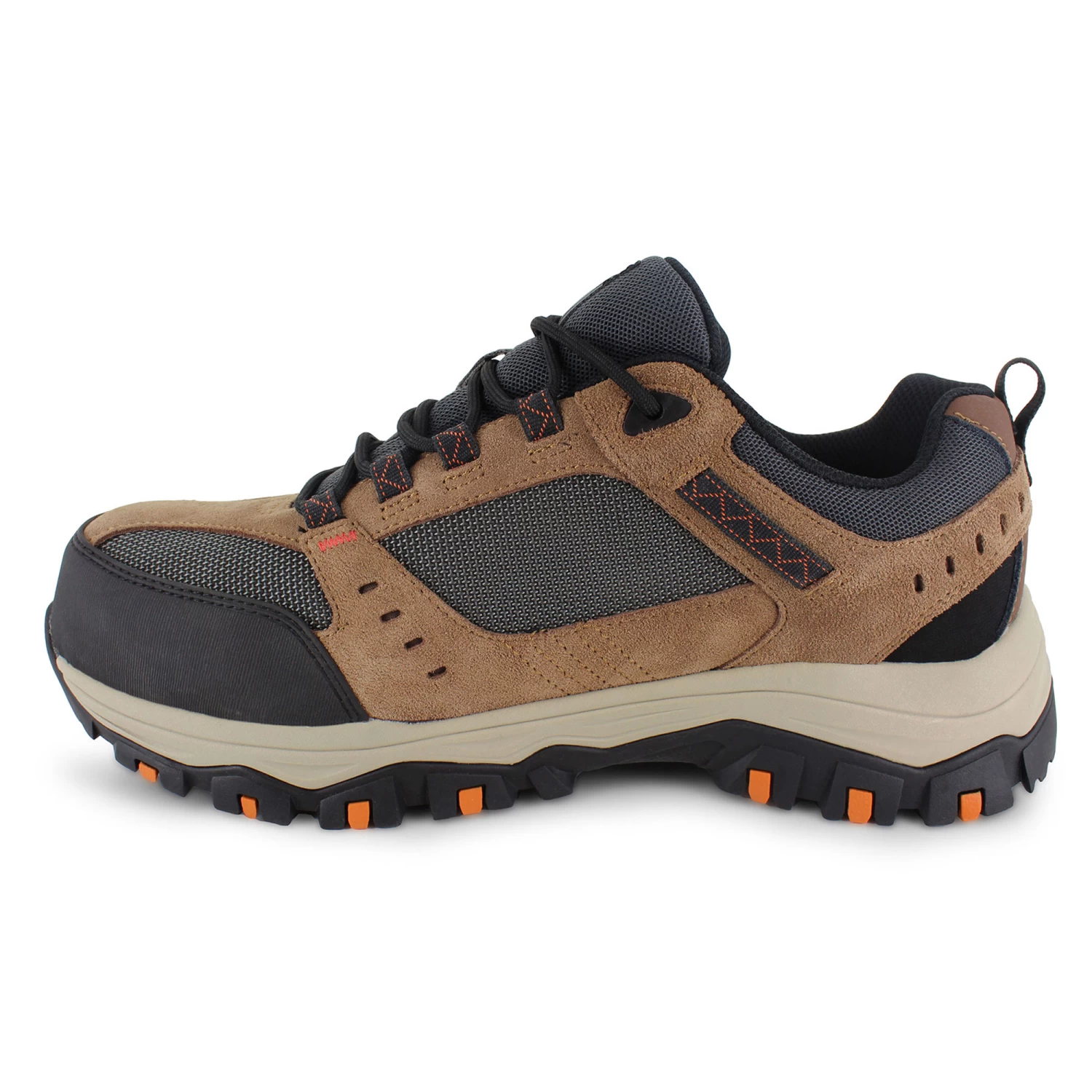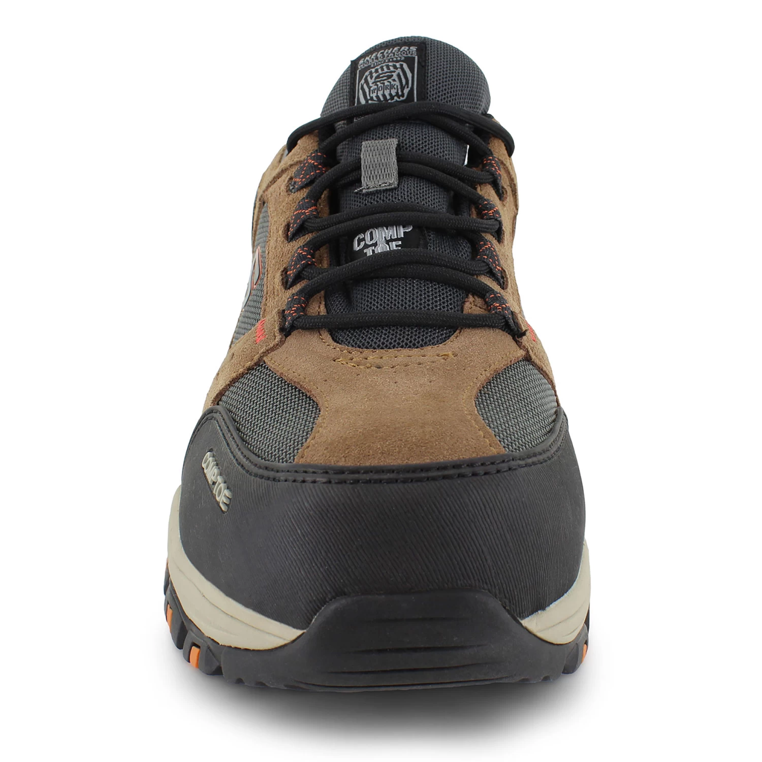 The Skechers Work: Greetah is a tough sneaker that works as hard as you do. This hiking-styled work shoe has an electrical hazard rating and features a composite safety toe for added protection. The seam-sealed waterproof construction is crafted with a durable suede upper and a high traction rubber outsole that provides reliable stability where you need it most. A secure lace-up front closure keeps your foot secure in place, while a padded tongue and collar add extra support to each step.
