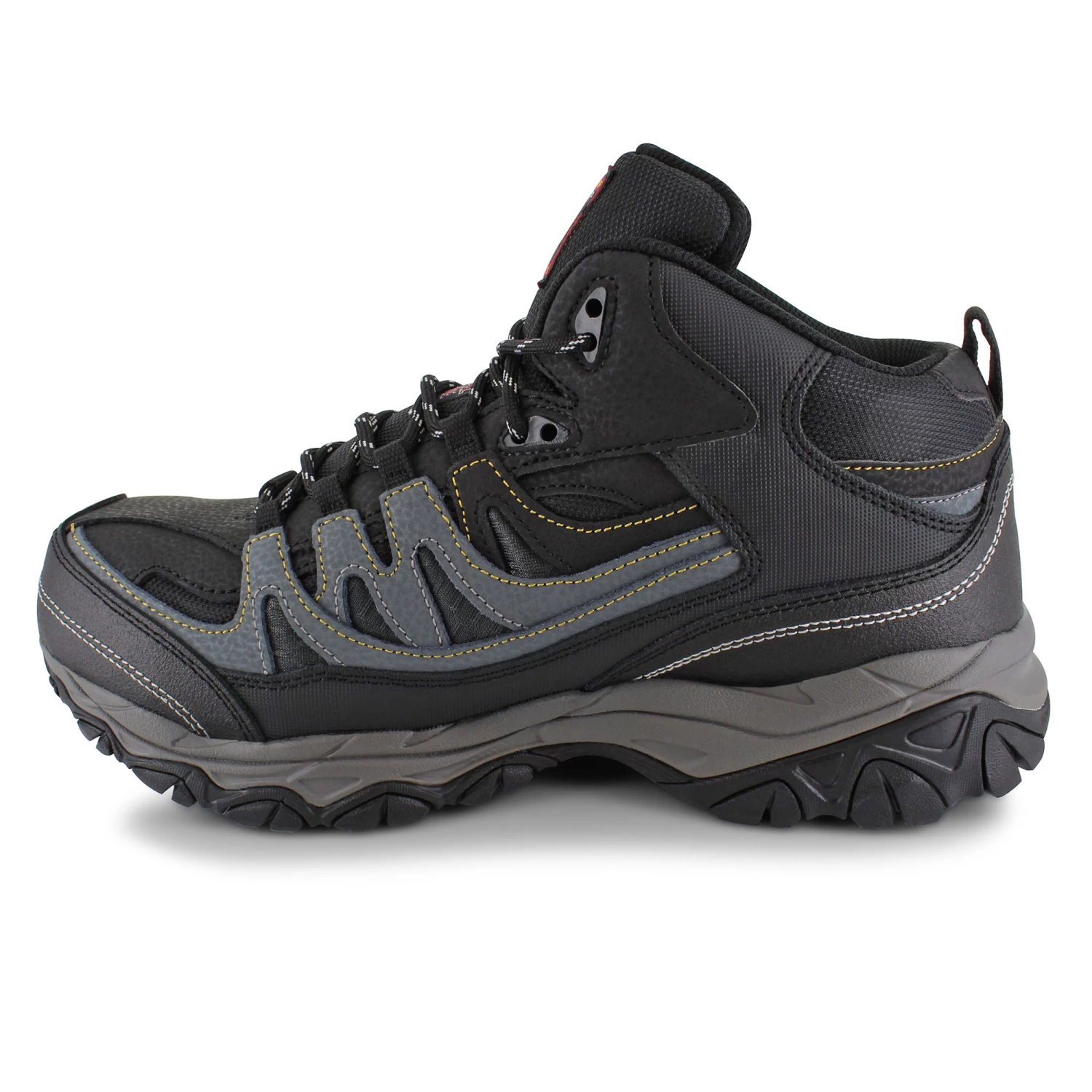 The Skechers Holdredge – Rebem is comfortable all in one stylish yet durable hiking boot design. Crafted from synthetic leather with overlays that offer additional support and durability when combined with a steel safety toe. The Relaxed Fit design and mesh panels provide a roomy yet breathable feel that keeps your feet feeling refreshed. A Gel-Infused Memory Foam insole cushions your foot to the max for all-day comfort while a shock-absorbing midsole and slip-resistant rubber outsole ensure superior support and traction.