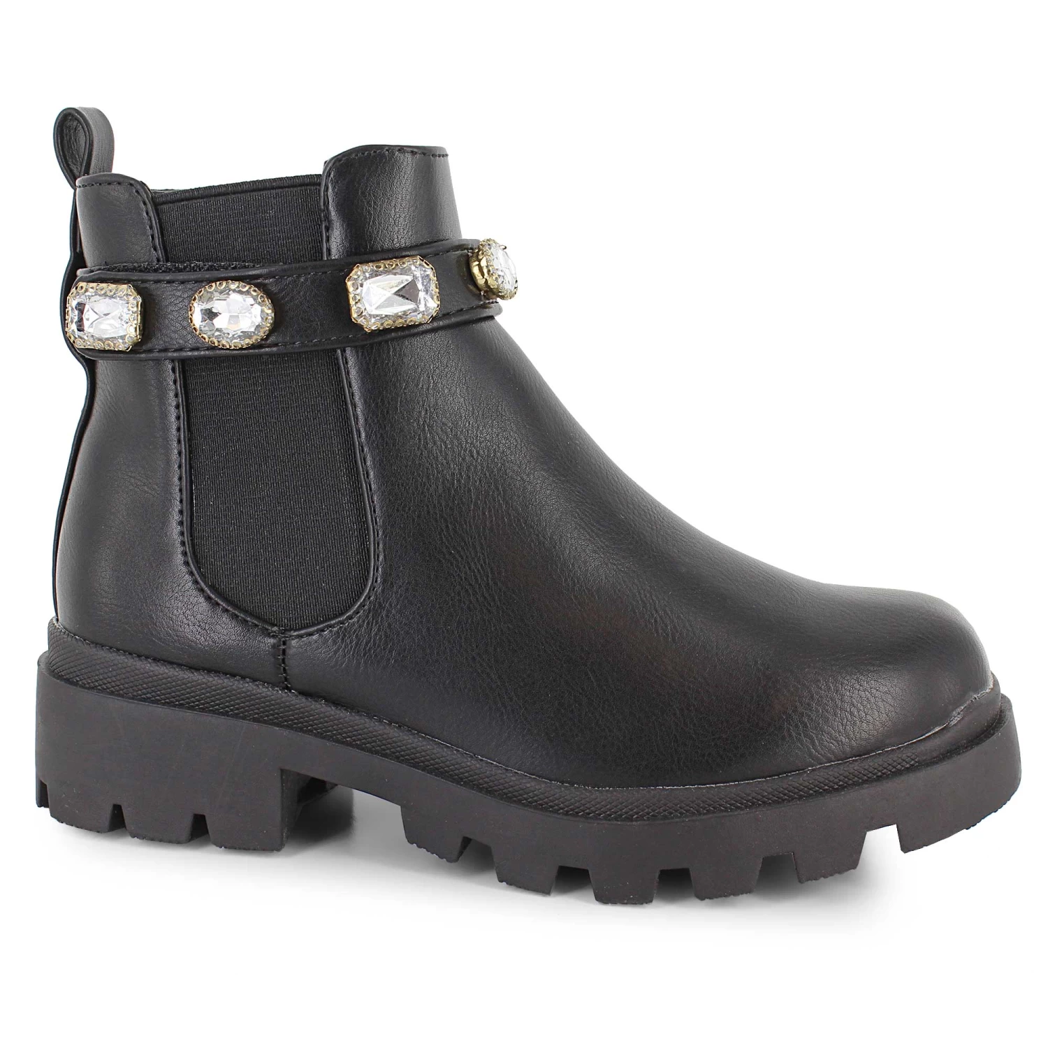 - wrap-around hook-and-loop strap around front of ankle with large rhinestone gem accents