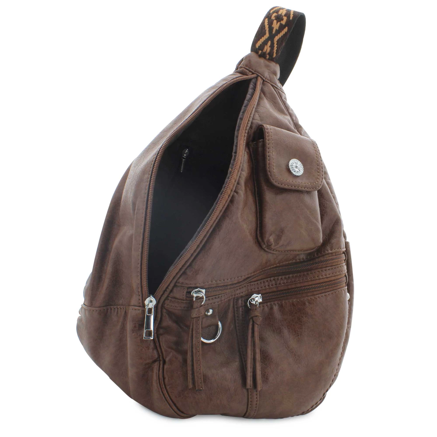 This stylish distressed faux-leather sling would be the perfect addition to any casual outfit. It’s spacious interior can accommodate most of your needs and keep your personal effects close at hand. Grab your new bag and head out on your way. Shop SHOE SHOW MEGA today.