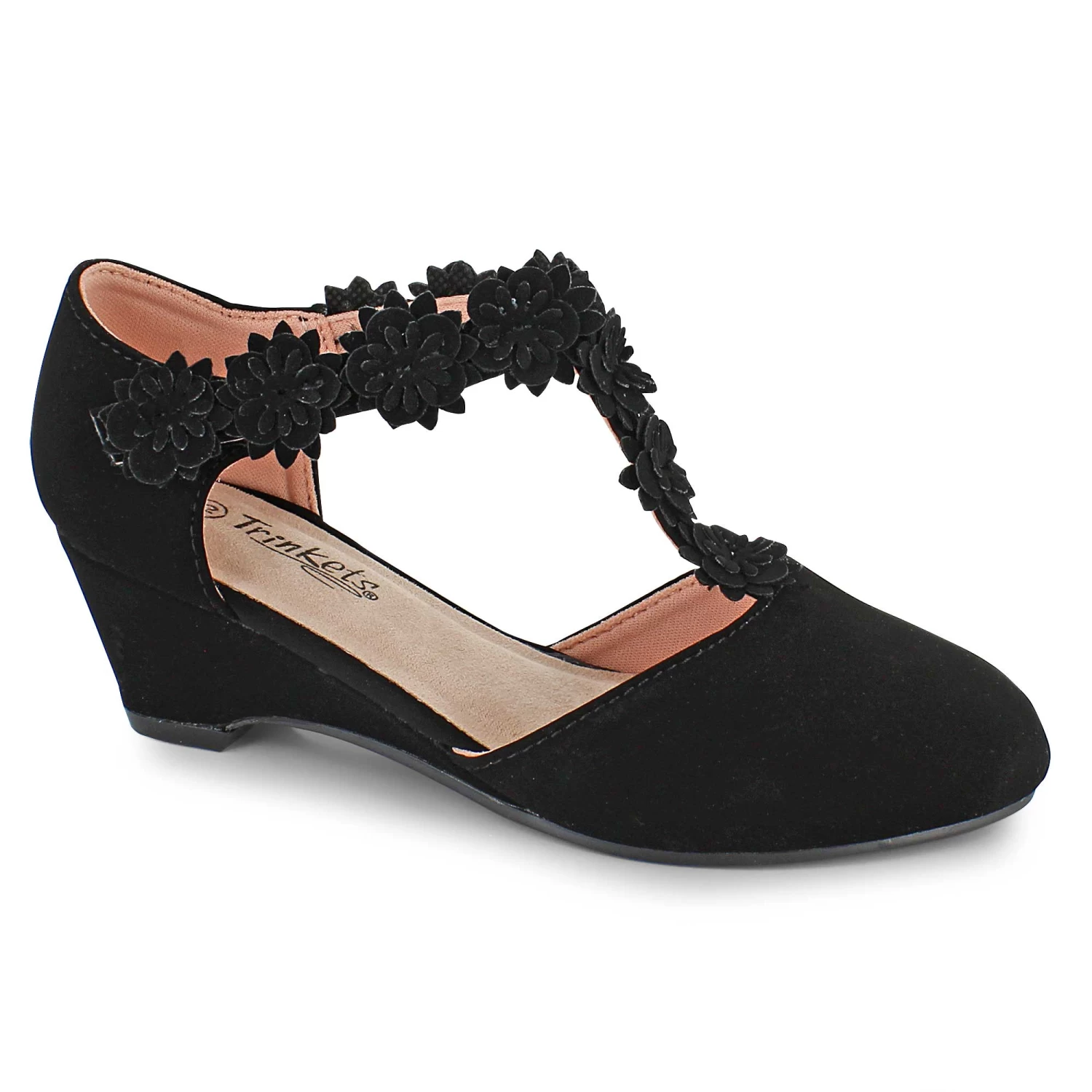 Look picture-perfect in these pretty dress shoes by Trinkets. Decorative flower accents add a cute whimsical touch without overwhelming your wardrobe. A low wedge heel and convenient strap closure add extra security and stability as you move.