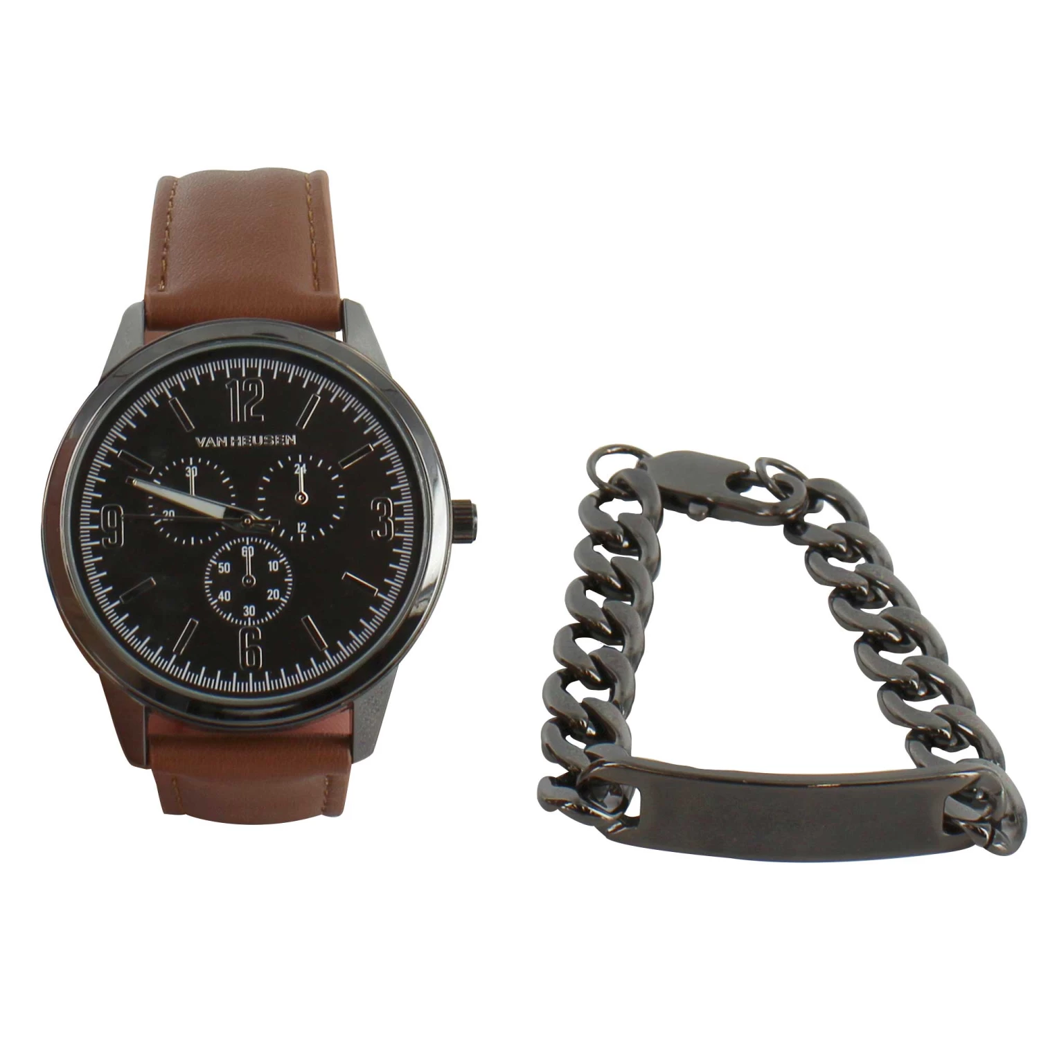 Take style up a notch with this Van Heusen chronograph watch and bracelet set. This box set includes a faux-leather band analog watch and a coordinating ID bracelet. There’s always time for a little extra fashion in your day.