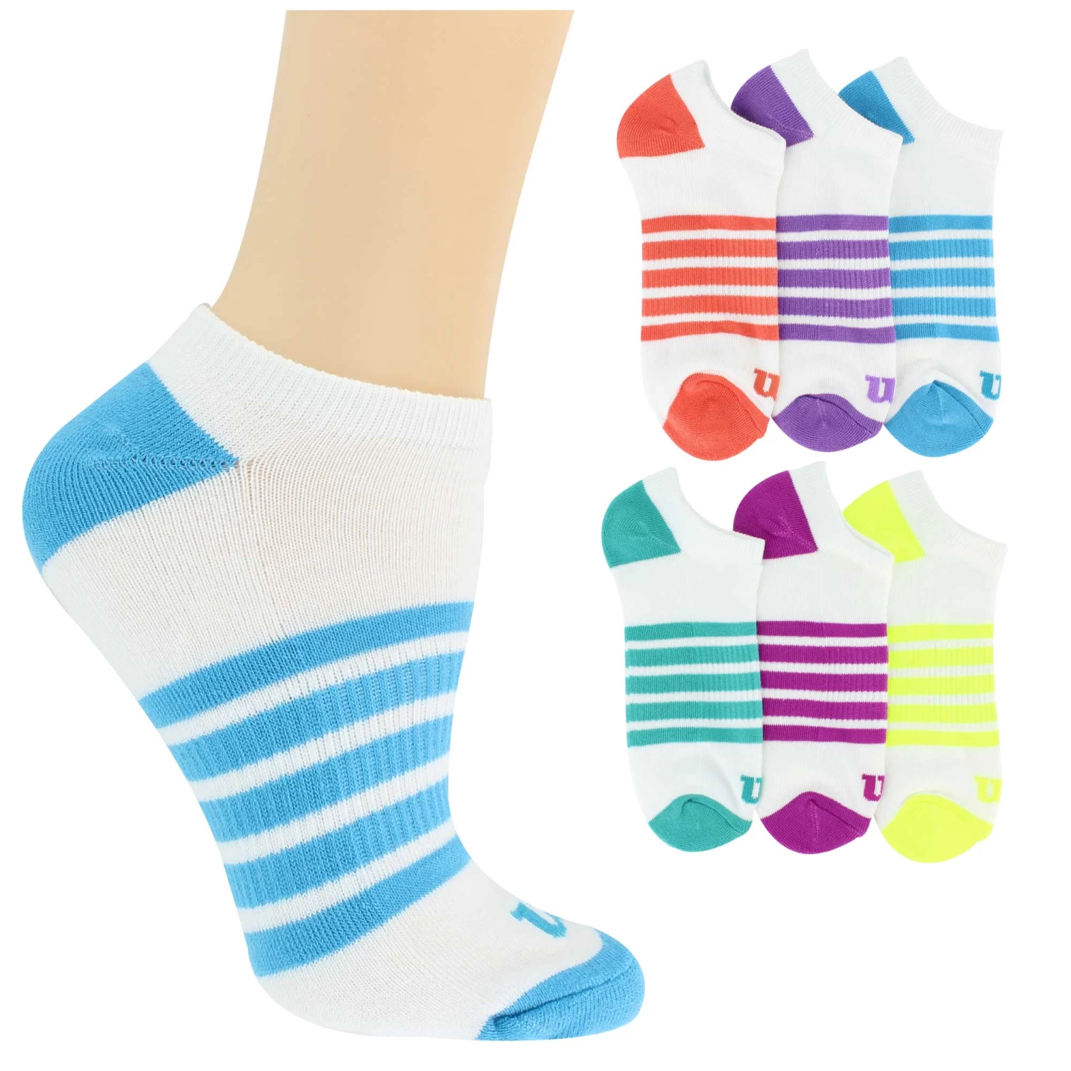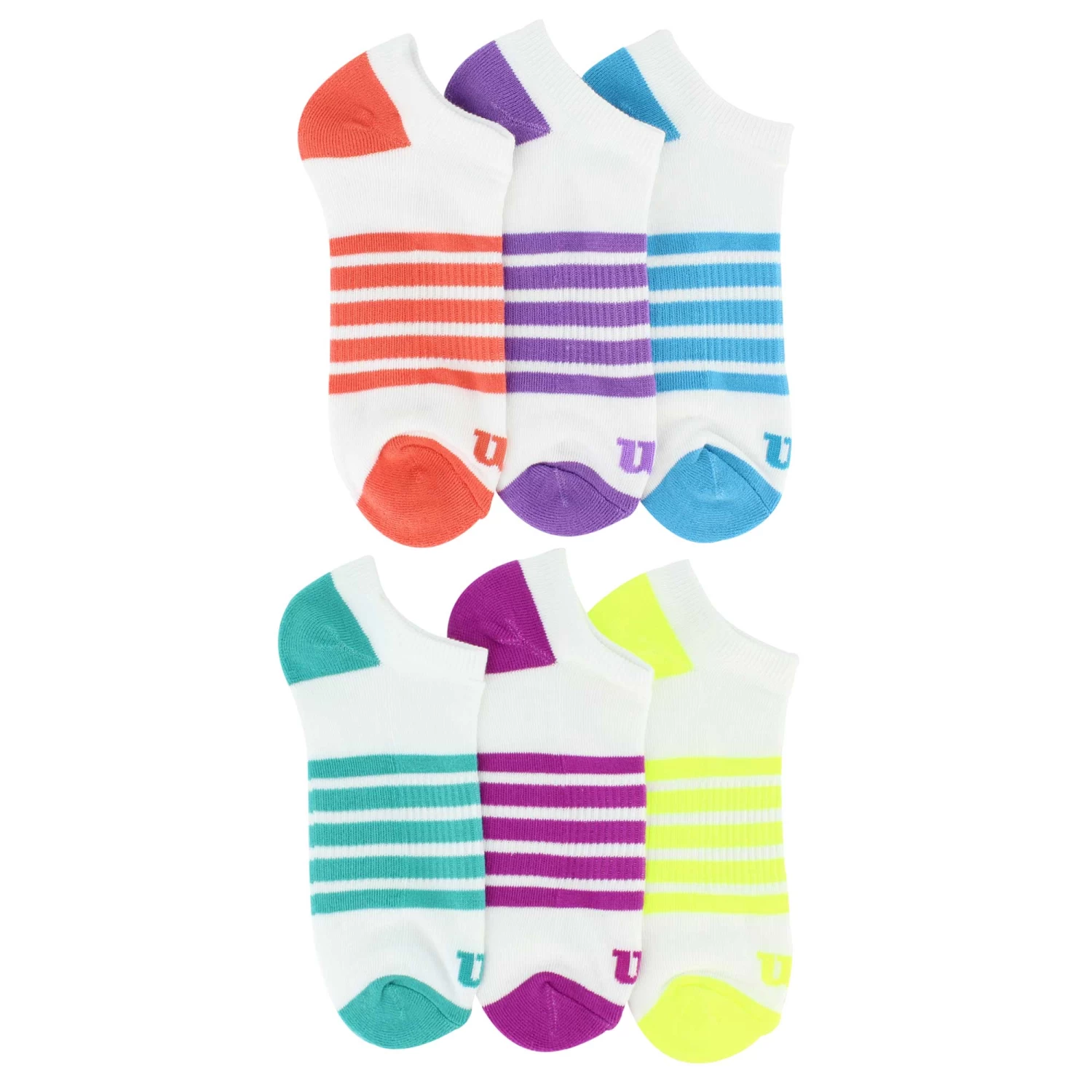 Stock up with this colorful assortment of striped no-show socks by Wilson. This casual selection could add a pop of color to your outfits, or add a bit more fun by mix-matching the pairs. These socks would be a great choice for your workout routine with their naturally wicking feature that will keep your feet dry during those hard sets.